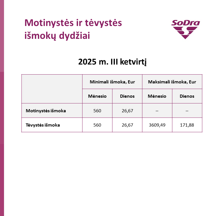 Minimali motinystės, tėvystės ir vaiko priežiūros išmokų riba yra lygi 8 bazinės socialinės išmokos dydžiams. Taip užtikrinama, kad motinystės, tėvystės, vaiko priežiūros išmokos būtų didesnės nei išmokos mokėjimo metu galiojantis minimalių vartojimo poreikių dydis. Taikomi bazinės socialinės išmokos dydžiai, galioję praeitą mėnesį iki teisės gauti išmoką atsiradimo dienos. Taigi, jei žmogus įgis teisę į motinystės, tėvystės arba vaiko priežiūros išmoką šių metų liepos, rugpjūčio arba rugsėjo mėnesiais, minimali šių išmokų riba bus 560 eurų.