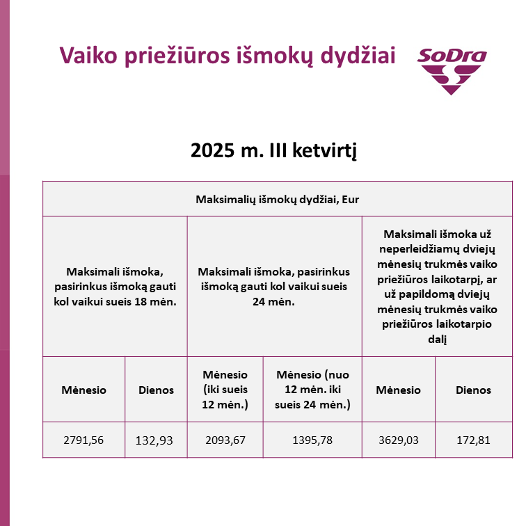 Pasirinkus vaiko priežiūros išmoką gauti kol vaikui sueis 18 mėnesių, maksimalus dydis didėja 5 eurais, nuo 2 786,64 euro iki 2 791,56 euro per mėnesį.